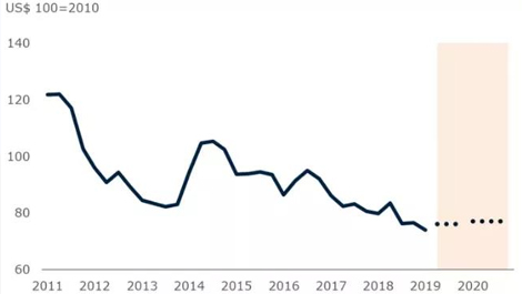 根據(jù)世界銀行的預(yù)測(cè),飲料價(jià)格指數(shù)在2019年下降5%之后,預(yù)計(jì)2020年將上升2%。世界銀行在11月將飲料價(jià)格的經(jīng)濟(jì)預(yù)測(cè)進(jìn)行了上調(diào),并預(yù)測(cè)下降趨勢(shì)將在2020年穩(wěn)定下來(lái)。世界銀行飲料指數(shù)
